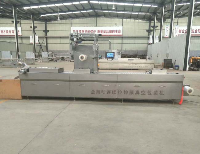 全自動拉伸膜真空包裝機適用于適用范圍廣泛,通常各種食品、海產品、肉制品、醫藥產品、果蔬、醬菜、冷鮮肉、五金原件、器械等產品的真空(充氣)包裝。特別適合于各種休閑食品(豆干、鳳爪、辣條、雞蛋、牛排、海產品等)的真空(充氣)包裝,延長產品保質期、保鮮期裝。采用日本三菱可編程控制器、F系列或A系列大型觸摸屏,選用三菱伺服走速或變頻全部采用日本、歐洲、臺灣等電器。設有完善的安全保護設施。